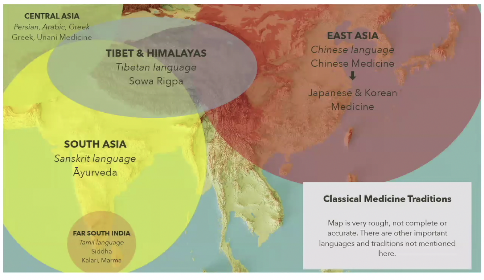 Dans le monde entier, on trouve des récits de sages ayant vécu bien au‑delà de l’espérance de vie humaine normale. Connus en sanskrit sous le nom de ṛṣis ou siddhas, au Tibet comme drang song ou grub thob, et en Chine comme xiān rén (仙人), leurs enseignements sont à l’origine des grandes traditions médicales et spirituelles asiatiques. Ils ont tous transmis des doctrines de rajeunissement et d’optimisation de la santé : rasāyana en Inde, chülen (bcud len) au Tibet, kāya kalpam au Tamil Nadu et yǎng shēng (養生) en Chine. Chacune de ces pratiques représente un point de rencontre entre un grand système médical asiatique – Āyurveda, Sowa Rigpa, Siddha ou TCM – et les systèmes spirituels associés : hindou, bouddhiste Vajrayāna ou taoïste.